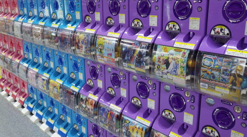 You put in a coin, twist the handle, and out comes a sealed capsule with a mystery toy inside. High chance of something common & a tiny chance of something rare.