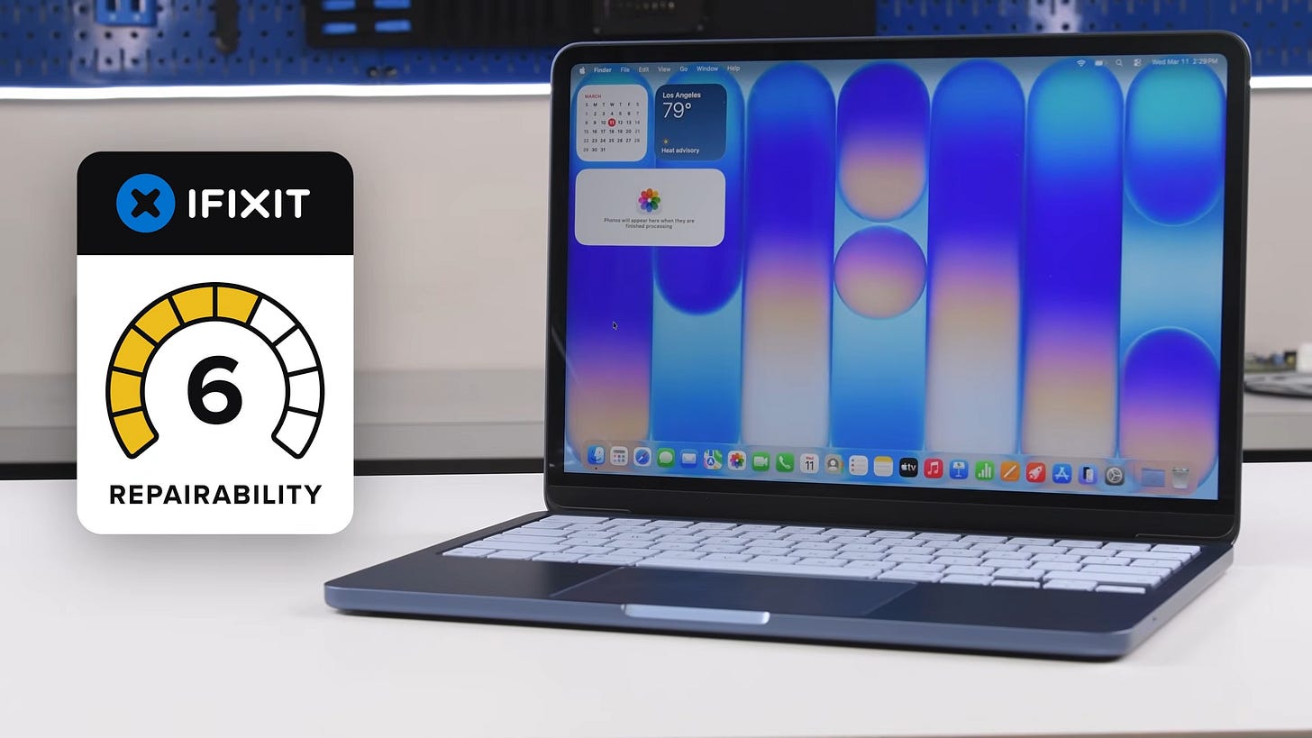 iFixit gave it a 6 out of 10. The M5 MacBook Pro scores 4 out of 10. The M4 MacBook Air scores 5. A score of 6 from iFixit is the highest any MacBook has scored in approximately fourteen years.