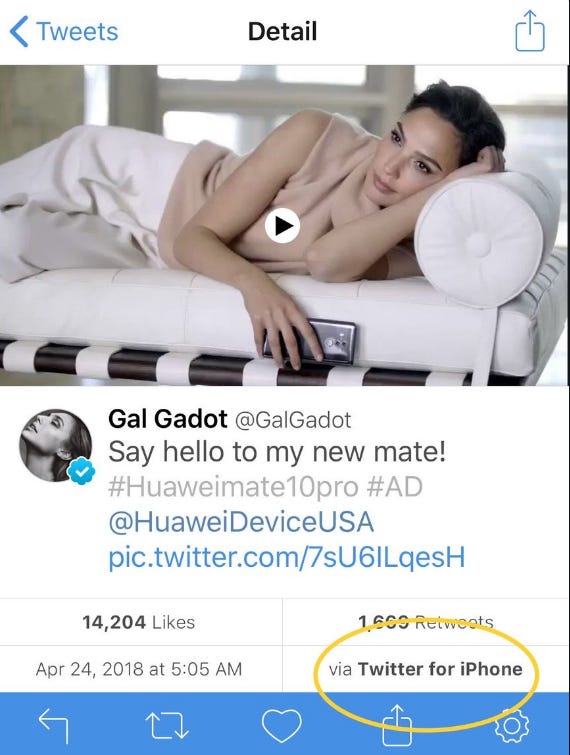 There have been countless examples of this - creators endorsing products they’ve never even used, just because the paycheck was good enough. One of the biggest examples was Gal Gadot - Huawei’s official brand ambassador, who got caught tweeting about how much she loved her Huawei phone…from an iPhone, lol.