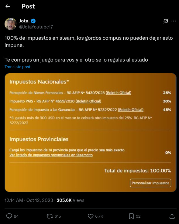 On top of everything else, Argentina also has a gut-wrenching tax on Steam purchases. According to users, “you buy one game for yourself and another for the government.”