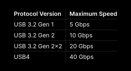 To add to the confusion, the USB version being used in a USB-C connector can have significantly different speeds. I won't bore you guys with an explanation of each version but just to give you an idea, you can have two USB-C cables that look the same but have vastly different speeds because of different versions of the USB standard they're using.